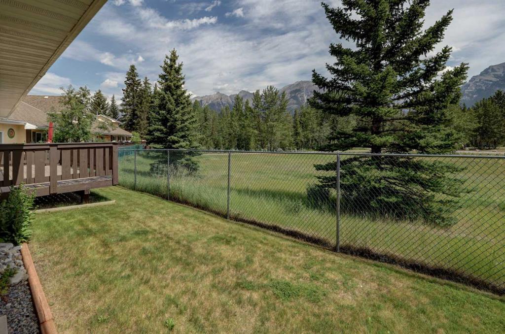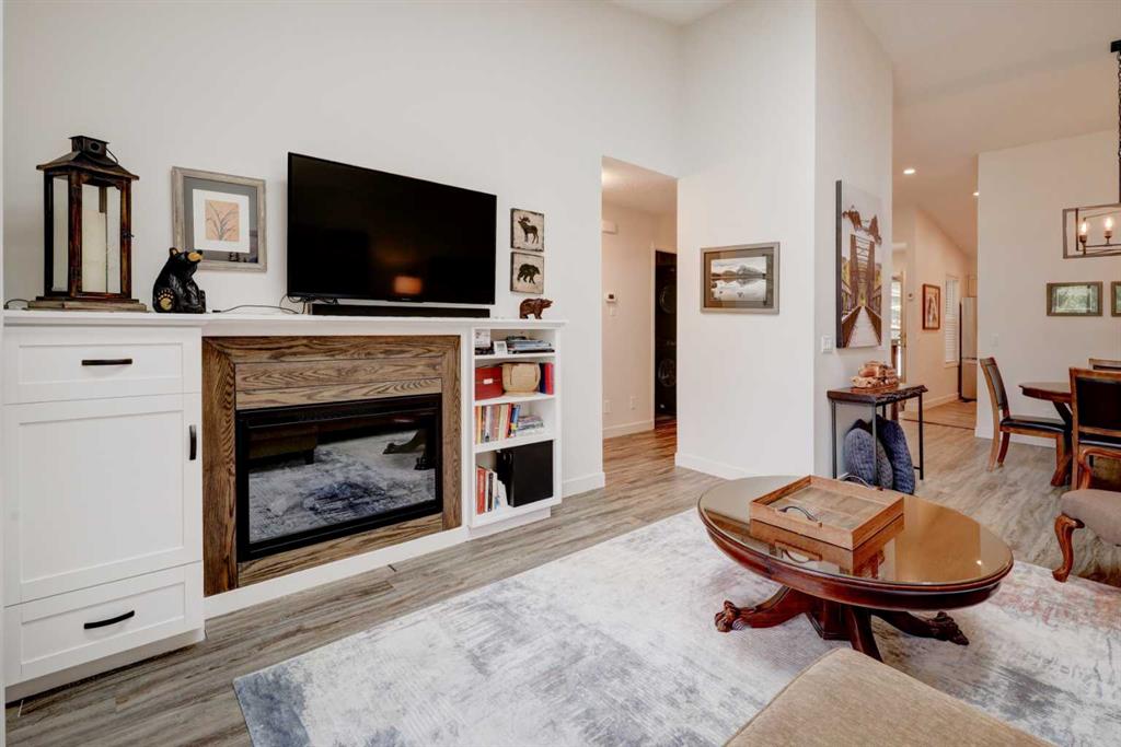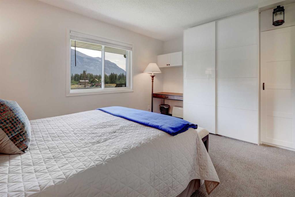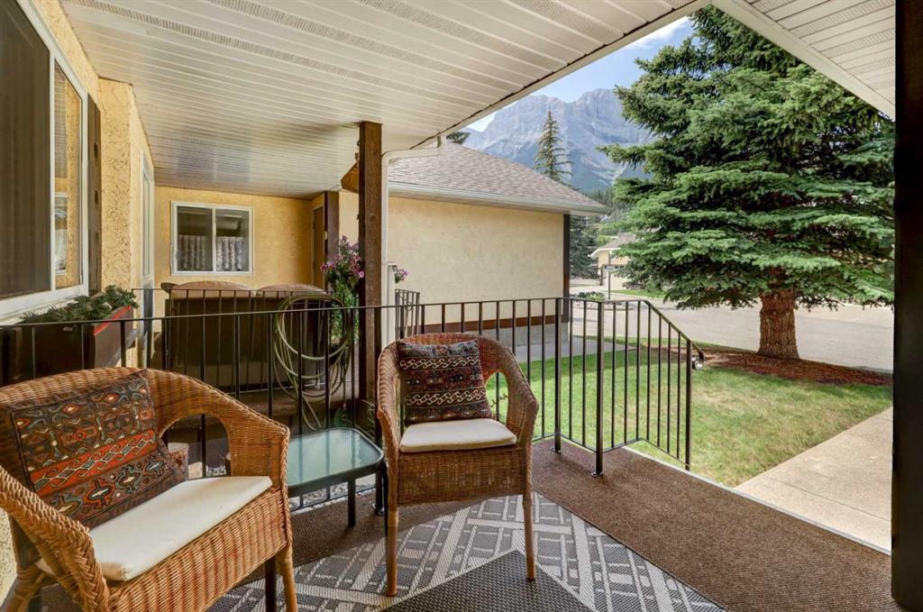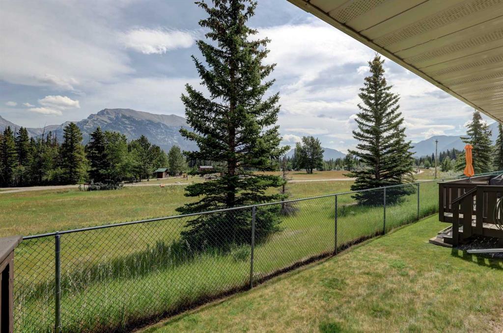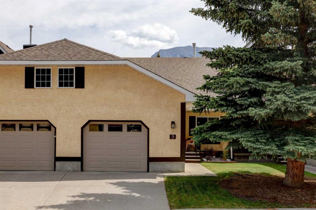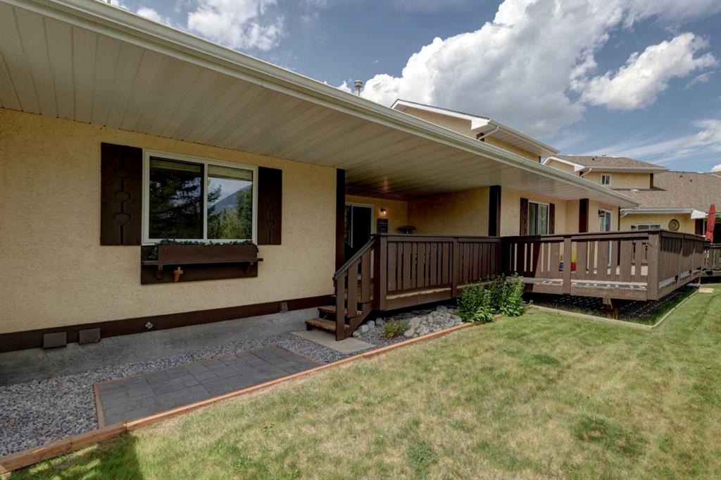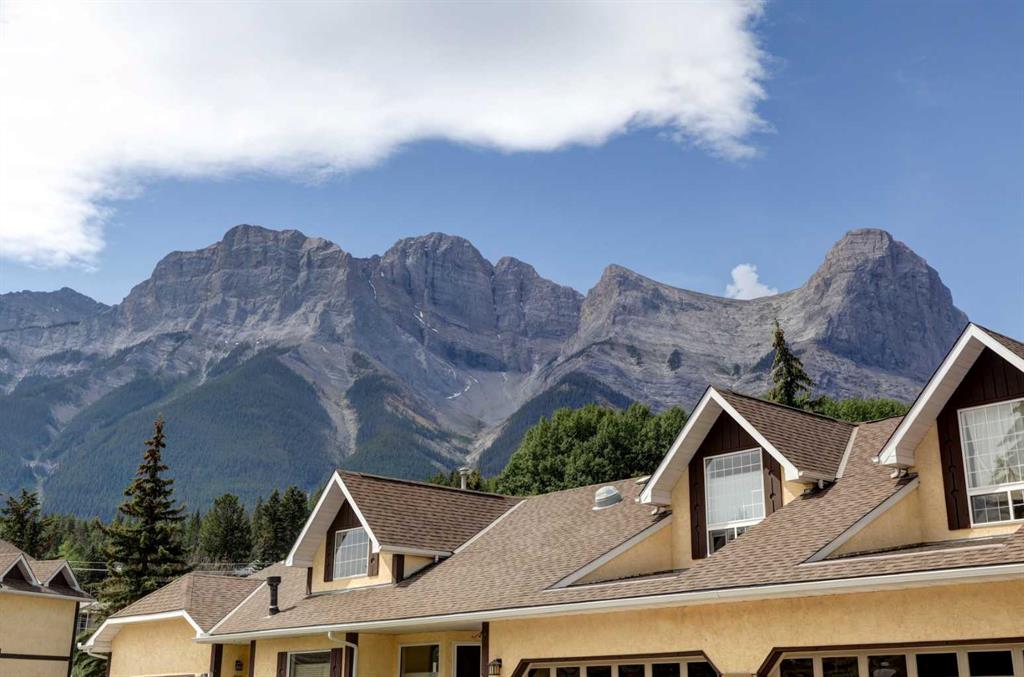 RARE OFFERING – VIEWS – TRANQUILITY – GREEN SPACE - Welcome to Mountain Shadows, an exceptional bungalow villa nestled in a serene 55+ complex, backing onto West Canmore Park and the Bow River—just five minutes from downtown. Thoughtfully upgraded and meticulously maintained, this home offers 1,148 sq ft of beautifully developed living space, blending comfort, functionality, and natural beauty. Step up to the inviting front patio and take in stunning views of Ha Ling and Miner's Peak. Inside, the main level opens to a spacious foyer that leads into an updated kitchen, featuring two-toned oak cabinetry, stainless steel appliances, a moveable island, and a generous pantry. The open-concept dining and living areas are perfect for entertaining or simply relaxing, with designer lighting, built-in storage, and a cozy electric fireplace. Living space also features newer double skylights that fill the space with natural light, and are complemented by recently added blown-in insulation in the lofted ceiling for enhanced comfort and efficiency. All other windows were recently installed. The patio door opens onto a covered deck with an additional lower patio, offering sweeping views across to Grotto Mountain and backs onto the peaceful green space of West Canmore Park. The primary bedroom is a true retreat with mountain views, dual wardrobes, built-in desk and cabinetry, and a beautifully appointed ensuite featuring double sinks with storage, an oversized walk-in shower, and toilet area. The spacious second bedroom also enjoys mountain views and includes a double wardrobe. A fully renovated four-piece main bathroom, a dedicated laundry room with newer washer and dryer, and stair access to the undeveloped basement round out the thoughtful layout. The basement itself offers a wealth of potential, whether used as a gym, hobby area with built in craft tables/worskhop areas, or a play space for visiting grandchildren. An oversized, insulated, and heated garage provides secure parking and additional storage. Residents of Mountain Shadows also enjoy access to a well-appointed clubhouse—perfect for social gatherings, meetings, or casual games of pool or shuffleboard. There is abundant visitor parking as well. This is a rare opportunity to enjoy peaceful, low-maintenance living in a prime Canmore location, surrounded by the natural beauty of the Rocky Mountains. Don’t miss your chance to make this your dream retirement retreat.