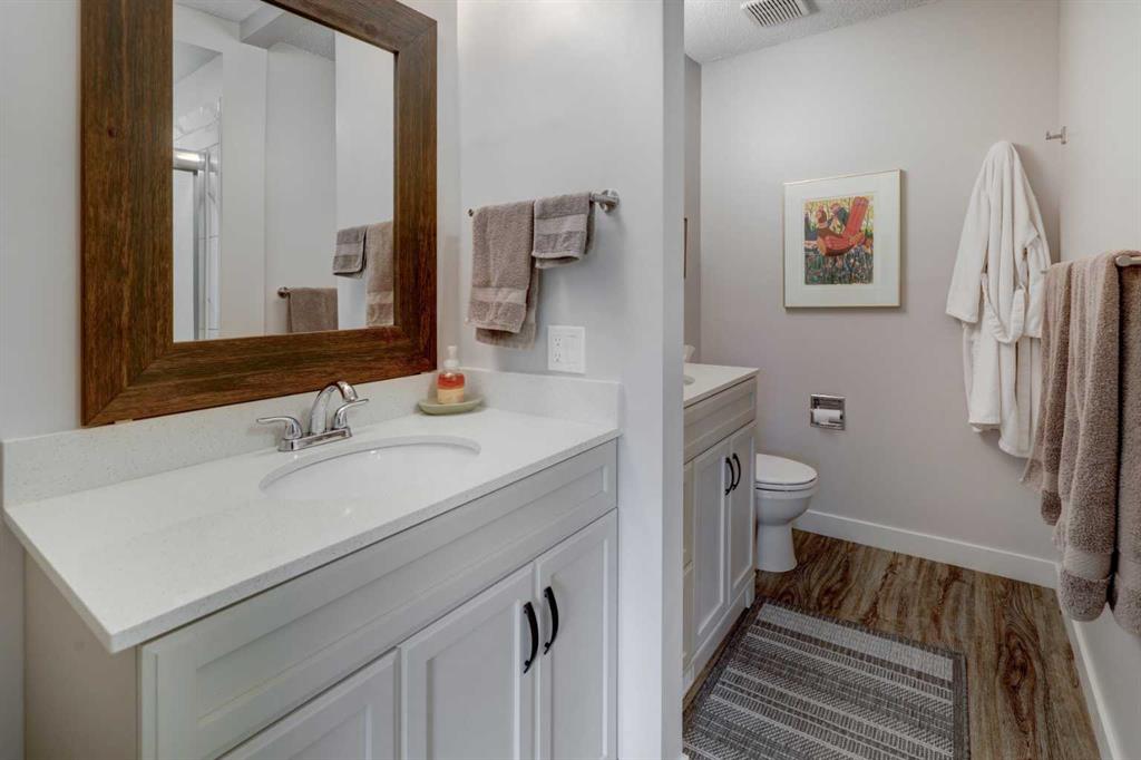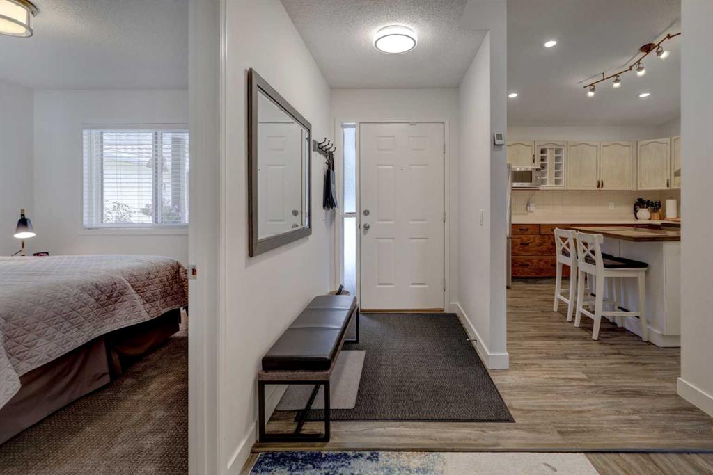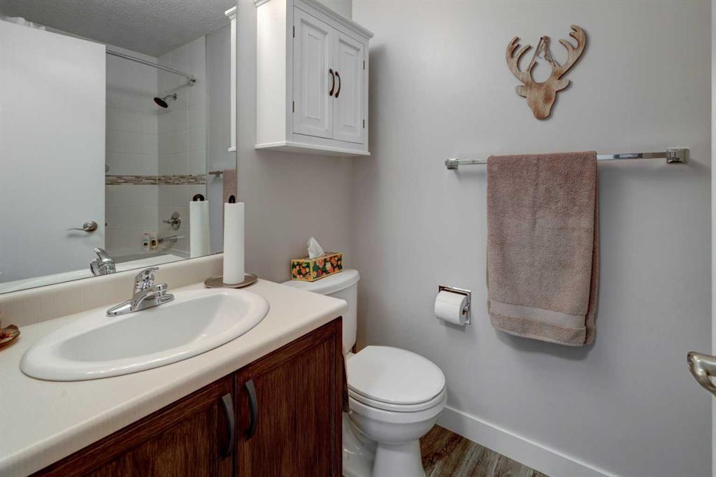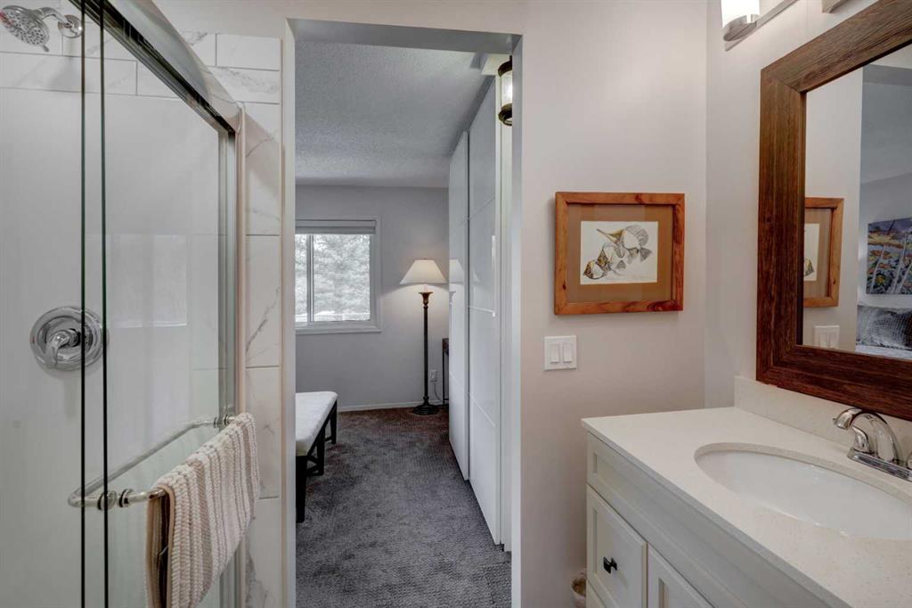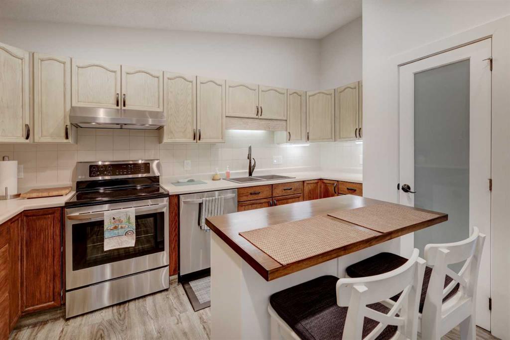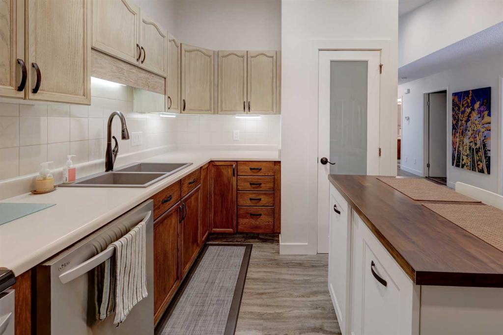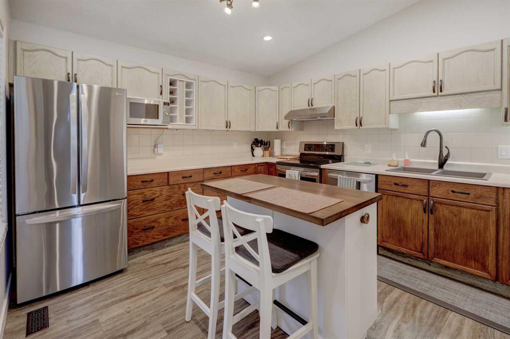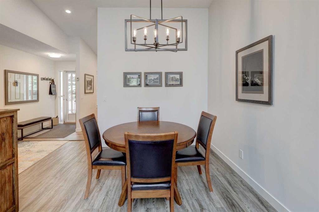 RARE OFFERING – VIEWS – TRANQUILITY – GREEN SPACE - Welcome to Mountain Shadows, an exceptional bungalow villa nestled in a serene 55+ complex, backing onto West Canmore Park and the Bow River—just five minutes from downtown. Thoughtfully upgraded and meticulously maintained, this home offers 1,148 sq ft of beautifully developed living space, blending comfort, functionality, and natural beauty. Step up to the inviting front patio and take in stunning views of Ha Ling and Miner's Peak. Inside, the main level opens to a spacious foyer that leads into an updated kitchen, featuring two-toned oak cabinetry, stainless steel appliances, a moveable island, and a generous pantry. The open-concept dining and living areas are perfect for entertaining or simply relaxing, with designer lighting, built-in storage, and a cozy electric fireplace. Living space also features newer double skylights that fill the space with natural light, and are complemented by recently added blown-in insulation in the lofted ceiling for enhanced comfort and efficiency. All other windows were recently installed. The patio door opens onto a covered deck with an additional lower patio, offering sweeping views across to Grotto Mountain and backs onto the peaceful green space of West Canmore Park. The primary bedroom is a true retreat with mountain views, dual wardrobes, built-in desk and cabinetry, and a beautifully appointed ensuite featuring double sinks with storage, an oversized walk-in shower, and toilet area. The spacious second bedroom also enjoys mountain views and includes a double wardrobe. A fully renovated four-piece main bathroom, a dedicated laundry room with newer washer and dryer, and stair access to the undeveloped basement round out the thoughtful layout. The basement itself offers a wealth of potential, whether used as a gym, hobby area with built in craft tables/worskhop areas, or a play space for visiting grandchildren. An oversized, insulated, and heated garage provides secure parking and additional storage. Residents of Mountain Shadows also enjoy access to a well-appointed clubhouse—perfect for social gatherings, meetings, or casual games of pool or shuffleboard. There is abundant visitor parking as well. This is a rare opportunity to enjoy peaceful, low-maintenance living in a prime Canmore location, surrounded by the natural beauty of the Rocky Mountains. Don’t miss your chance to make this your dream retirement retreat.